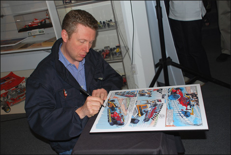 | Philippe Graton autographie une planche de dessins du livre sur Gilles Villeneuve. |