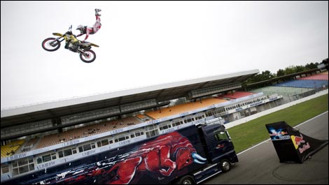 Les Red Bull X-Fighters ont donné un spectacle haut en couleur dans le paddock du circuit de Hockenheim quand la Formule 1 a terminé ses essais privés en préparation au Grand Prix d'Allemagne. Le pilote de moto Busty Wolter a fait frémir les membres des écuries de F1 quand il a effectué une série de sauts périlleux au-dessus du camion de l'écurie Toro Rosso. Puis, Wolter a sauté par-dessus les pilotes Sebastian Vettel et Mark Webber qui se tenaient debout sur le camion! Photos : GEPA pictures/ Euro Newsroom/ Joerg Mitter