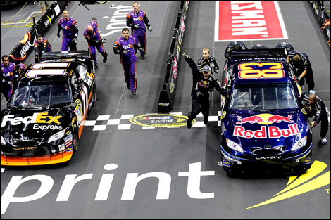 The crew of the No. 83 Red Bull Toyota driven by Brian Vickers won the NASCAR Sprint Cup Series Pit Crew Challenge, beating the crew of the No. 11 Joe Gibbs Racing Camry. Vickers' crew were taking part in the event for only the second time after joining the series last year, beating their more experienced rivals with a time of 22.902 seconds, 0.109 seconds quicker than what the Gibbs crew took to complete a pit stop and push the car through the finish line. Interestingly, specialists and former collegiate athletes rather than mechanics or team personnel working at the team's shop formed the winning Red Bull team, a new trend in NASCAR racing. Photo Credit : Jerry Markland/Getty Images for NASCAR