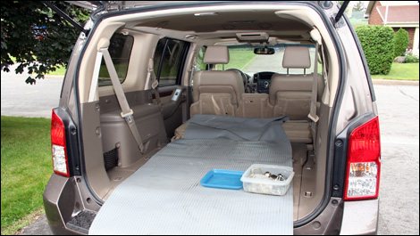 Vaste compartiment à bagages Comme le démontrent nos photos, nous avons utilisé tout l'espace disponible pour y loger nos outils, notre équipement, notre bouffe et nos effets personnels. Nous partions pendant cinq jours pour participer à la Coupe du Président au circuit de Mosport, en Ontario. La troisième rangée de sièges se dissimule bien dans le plancher. Mais les dossiers de la deuxième banquette demandent un effort pour les replier et ne parviennent pas à se placer à la même hauteur que le plancher arrière. Il faut souligner l'excellent emplacement des divers crochets d'arrimage tout au long du plancher, notamment ceux du pilier C, près de la portière arrière. D'accès facile, ils nous ont permis d'attacher solidement le matériel pour éviter des déplacements fortuits lors d'arrêts ou de manoeuvres sur la route. C'est l'un des seuls utilitaires sport à offrir autant de points d'ancrage pratiques.