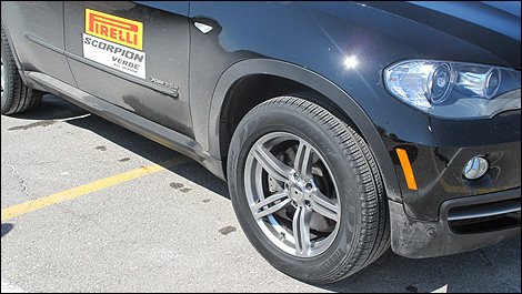 Nous avons eu l’occasion de mettre ce nouveau pneu vert à l’essai sur le fameux circuit de cônes. Pirelli avait fourni deux utilitaires diesel BMW X5 identiques : l’un était chaussé des pneus Scorpion Verde et l’autre de pneus Michelin Latitude Tour HP (ce dernier n’était pas un pneu écologique, bien que Michelin en offre une telle version).
