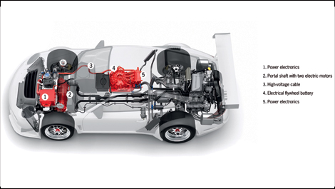 The flywheel generator itself is an electric motor with its rotor spinning at speeds of up to 40,000 rpm, storing energy mechanically as rotation energy. The flywheel generator is charged whenever the driver applies the brakes, with the two electric motors reversing their function on the front axle and acting themselves as generators.