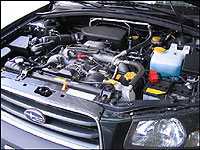 Tel que mentionné, les routes n'étaient pas très glissantes durant mon essai, mais à l'occasion, elles l'étaient et la Subaru s'arrêtait de façon sécuritaire et efficace. Un autre sujet où la Forester excelle est l'habitacle. Dans celle que j'avais à ma disposition, les sièges garnis de tissus à deux teintes de gris procuraient confort et style. Chauffants à deux niveaux de température, ils offraient également des ajustements manuels à six directions avec support lombaire. Le tableau de bord comprend des instruments analogues avec aiguilles illuminées rouges et des garnitures argentées. On retrouve aussi un thermomètre de température extérieure et un compteur journalier numérique à deux modes. L'habitacle comprend également un système audio de qualité AM/FM stéréo/bande météo avec lecteur DC et quatre haut-parleurs.  | | Le moteur atmosphérique couplé à la transmission manuelle à 5 rapports permettait à la Forester de réaliser le 0-100 km/h en 9,3 secondes. (Photo : Alexandra Straub, Canadian Auto Press)