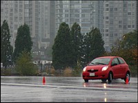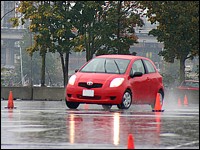la pluie - elles sont toutes bonnes. La Yaris s'est montrée superbe sur le petit parcours aux cônes orange, mordant la chaussée même quand je la poussais au-delà des limites raisonnables. Son centre de gravité est un tantinet élevé, ce qui provoque un léger tangage lors des manoeuvres de transition latérale, mais son comportement n'est pas du tout déconcertant et l'équilibre de la voiture n'est jamais remis en question.