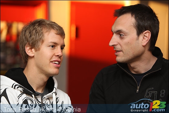 L'équipe de Formule 1 Toro Rosso fait une visite chez Kart-O-Mania de Montréal, le 4 juin 2008 dans le cadre des activités du GP du Canada. À gauche le pilote Sébastien Vettel.