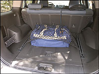 The cargo area, accessed by a swing-up gate, is of the plastic "easy-clean" variety. Nissan's Utili-Trak channel system sees two channels installed longitudinally in the floor, into which moving tie-down hooks are installed. Other tie-downs on the sides of the cargo bay make for easy securing of bulky items. A stretchy cargo net keeps smaller items under control. The full-size spare tire is under the small hidden storage compartment, itself under the main cargo deck.