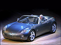 General Motors Vice Chairman Bob Lutz drives out onto the stage in the new 2006 Pontiac Solstice Sunday, January 4, 2004 at the North American International Auto Show at Cobo Center in Detroit. (Photo: General Motors of Canada)