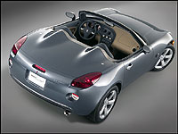 stout coffee to ensure that I wasn't in some sort of automotive nightmare in which Bob Lutz was tempting me into damnation with a Mazda Miata priced Pontiac-built super-roadster. I mean, what well-grounded automotive fanatic would buy the notion that Pontiac would, or even could, produce a high-performing, poor-man's Boxster or S2000, and sell it at close to econo-car prices? Coffee and pinch marks aside, the Solstice is a sensuously designed 2-seat, wind in the hair, roadster. Take away the split Pontiac grill dominating a curvaceous nose and thoughts of a European origin are kindled. Is it Italian or German, no it must be French? Oh so sorry Pierre, the Solstice is pure American mettle.
