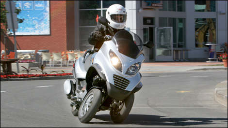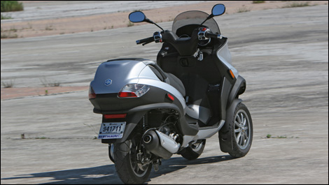 It stands by itself!As mentioned earlier, the MP3 is equipped with an hydraulic suspension locking system that I find particularly clever. However, it requires special attention at idle. You can lock the MP3 in the upright position by pressing a switch on the right handlebar; the only thing left to do is to put your feet down. How convenient when waiting at a stop light! The system automatically shuts off when you accelerate, but you need to perform steady takeoffs if you don't want to risk falling. You can also engage the system upon bringing the scooter to a full stop: the yellow indicator then starts to flash, telling you that the scooter's speed and the engine's allow the locking device to be activated. No more need to put the vehicle on its stand, no matter how easy it is. An advanced scooterWhile some improvements still need to be made, the Piaggio MP3 is a huge step towards the future. Designed for city use, it provides a reassuring riding experience. Its stability and comfort levels are clearly higher than the competition.  | | Primarily designed for city use, the MP3 is more than capable on byroads. | Photo Credit : Philippe Champoux