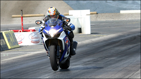 One more push of the button activates the C mode (Calm? Comfort?). The GSX-R1000 now hauls like a 750-cc motorcycle and you feel like there's only 125 horsepower on tap. This mode is great for beginners who want to learn how to ride such a sports bike or for those who wish to perfect their skills under the rain. Never forget that you're riding the bomb of the year, though...