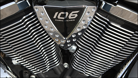 Modern powertrainThe 2008 Victory Vision Tour is powered by a revised 1,731-cc 50-degree V-twin. To get such a high displacement, engineers increased the stroke by 6 millimeters for a total of 102. The air/oil-cooled engine uses an electronic fuel injection system featuring dual 45-millimeter throttle bodies. It generates 92 horsepower and 109 pounds-feet of torque, easily enough to pull this 385-kilogram mastodon with enthusiasm. Initial accelerations are decent, while mid-range power allows sports car-like passing maneuvers.