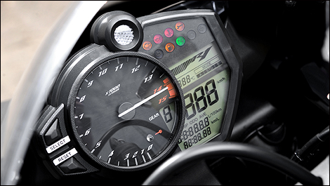| All the information you need is there, and easy to read, especially the big digital speedometer readout on the right, to stay below whatever limit you set yourself, and the gear indicator, to help learn the bike and make better use of the torque when having fun on the twisties. |