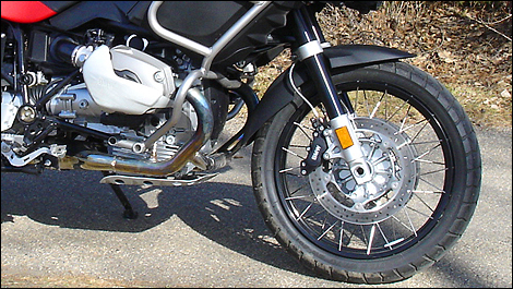 Suspension settings on the Adventure are set on the soft side for street riding. However, it does come with a range of adjustments that you can make yourself. Up front the BMW telelever suspension uses a central strut, with a preloaded spring that has five mechanically adjusted settings. My tester was at the factory setting and at 220 lbs. (99 kilos), I thought the compression and rebound was pretty darn good.