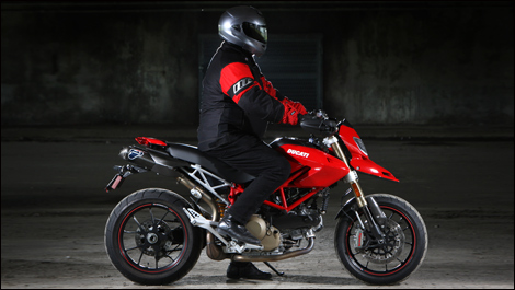The Hypermotard comes with a Full Monte of high quality components: the trademark steel tube trellis frame, Brembo radial-mount master cylinder and Monobloc callipers in front, adjustable Kayaba fork and Öhlins rear shock, a second radial master cylinder for the clutch, Marchesini forged alloy rims wrapped with near-race Pirelli Dragon Supercorsa III tires, a single-sided swingarm, and a lightweight 2–1–2 exhaust system, unfortunately still high mounted at the rear and likely to toast your buns in town.