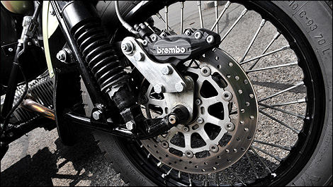| Oh yes, the American standards impose a high level of braking efficiency. So out with the drum and in with the ubiquitous Brembo kit and cobbled-up bracket. It works fine by the way. |