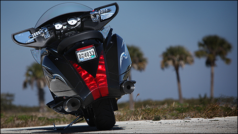 | The teardrop shape rear end looks sleek and aerodynamic, but it does unfortunately narrow down the rears bags to a less than adequate volume. (Photo: Philippe Champoux/Moto123.com) |