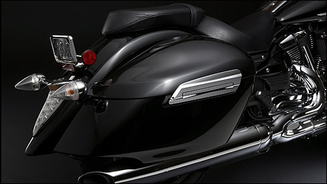 For the Deluxe, Yamaha replaced the windshield by a high and short fairing mounted on the impressive 1.25-inch diameter handlebars. The fairing features an iPod cradle linked to two quality loudspeakers, while buttons on the left grip allow you to adjust the sound system.