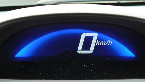 | A colored ring around the digital speedometer changes between green and blue to advise drivers of their fuel consumption performance in real time. |