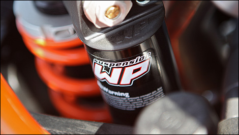 | Fully adjustable, high-end WP fork and shock are essential to sweet handling bike, on the street and the track. (Photo: Philippe Champoux/Moto123.com) |