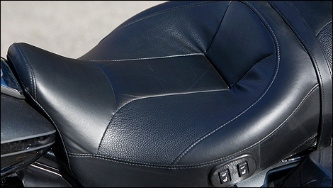 | Loved that comfy seat - wide a the back, narrow at the front, with electric heating and full trampoline-like suspension to absorb most of the hits on bumpy roads. (Photo: Philippe Champoux/Moto123.com) |
