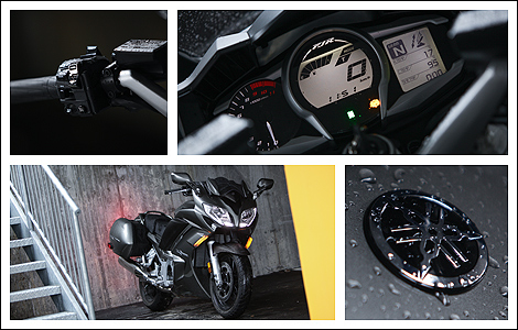 Sleek and neatly assembled, the 2013 Yamaha FJR1300 transpires quality. The new LED headlights and front turn signals add an exotic, modern touch, while the completely redesigned, multifunction instrument panel includes average fuel consumption and estimated range indicators, a gear position indicator, and even a 12V power outlet.