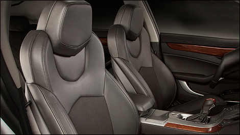 In the CTS, the Recaro seats include adjustable back and thigh support for the driver and front-seat passenger, including a seat cushion extender, among the 14 total adjustable elements. The seats feature French-stitched leather, with microfiber suede inserts in the center sections of the cushions and seatbacks, as well as heating and cooling functions.