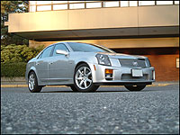 the throttle and slamming through the gears in Cadillac's wildly fast, 400-horsepower CTS-V. Prior to adding the "V" designator to the nomenclature of this 4-door road rocket, the CTS was no match for anything from Germany bearing an "M," "S" or "AMG" shield. Now it is and then some. In life before "V", the CTS was a capable midsize performance sedan exhibiting a chiseled appearance and turning in decent V6 performance figures, but missing something. I tested such a rendition several months ago and was lukewarm to the meat-grinder operation of its optional, high performance, 3.6-liter V6, which extruded a respectable, but uninspiring 255-horsepower and 252 pounds-feet of torque. A romp in the new "V" edition of Cadillac's Euro-hunter indelibly illustrates what the CTS had been missing the last couple of years: horsepower, torque and V8 growl. But wait, there's more to the glory of V, which is how Cadillac will identify future special performance editions within its model lines. Augmenting the insatiable power of GM's LS6, 5.7-liter (350 cu-in) V8 - drawn straight from the track dominating Corvette ZO6