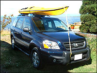 Fortunately the beast-of-burden serving us was a Honda Pilot. With some creative arranging, a little luck and a lot of heave-hoeing the following articles, less animate beings, were squeezed into the Pilot's generous confines: one insanely huge dog-crate, one 4-person inflatable boat (deflated of course), a guitar and case, one computer and case, a large picnic basket, two large coolers, three large gym bags, sleeping bags and pillows all around, various bags of food (including the canine variety) and many other sundries, utensils and sporting goods. Secured atop the Pilot on Honda's ski-rack equipped roof rails, was one ocean-going kayak and a mountain bike. The Pilot's Queen Mary-like hold swallowed the inside gear without objection and left the human occupied front seats and single, human occupied rear seat, clear of clutter - except for that introduced by a nine-year old, and his car-bag full of goodies.