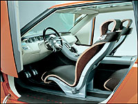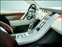 At center, the cabin is divided into two by a tall transmission tunnel. Its silver top runs front to back throughout the interior, forming the center console and information stack. Oddly, it's rather thin, but it features a small, swiveling TFT LCD display for climate, navigation and hi-fi. The driver is faced with a wood-rimmed, aluminum billet steering wheel, and four simple clock-like instruments that display all relevant information. Twin DVD-players keep rear occupants entertained as well. The interior has been trimmed in light colors and metals, infusing a bright and cheery ambience enhanced by warm orange back lights.