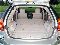 My fully-loaded tester accommodated up to six passengers when its 50/50 split-bench third row seat was in position; otherwise, its two front captains' chairs were matched by two second-row captains' chairs, making this a remarkably comfortable cruiser for four adults. Plenty of head and legroom surrounds the lucky four seated in the first two rows, but anyone forced into the third row had best be small in stature if they hope to be in any way comfortable during extended stays. Also, while being fairly high-backed, the third-row seat does not provide the