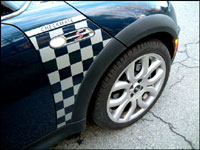 the limited edition Checkmate package is mostly visual, it includes performance enhancements such as Dynamic Stability Control (DSC), 17-inch Flame Spoke alloy wheels and front and rear fog lights. Checkerboard side decals, silver bonnet stripes, a silver roof and mirror caps, plus special Checkmate cloth/leather interior trim aggrandize the MINI's bulldog image. My tester was sent further upscale with a Premium Package that added chrome interior adornments, a panoramic glass sunroof, heated front seats, an auto dimming mirror, rain-sensing wipers and automatic headlights.