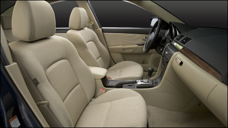 Plain yet modernInside, every Mazda3 gets the same mostly black dashboard. The orange backlighting adds a certain modern feel to the interior, but designers went a bit over the top with lights that blink according to the volume of the stereo.  | | The seat cushions are comfortable and the multiple adjustments at our disposal make it possible to find a good driving position. |