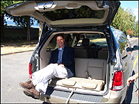| When it comes to configuring and removing rear seats, the Freestar is near the top of the heap with its effortless cantilevered system. Here, Bill Rowe, Freestar Brand Manager, shows the seat's versatility, using the headrests for a foot stool. (Photo: Trevor Hofmann, Canadian Auto Press) |