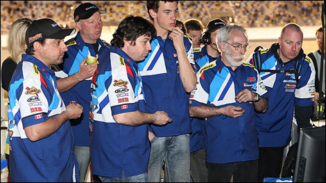 | Voici l'équipe qui abossé comme des fous avant et pendant les courses : les cheveux blonds appartiennent à Julie, la copine de Miguel, le mécano et chauffeur du camion Michael Chatelin, le mécano et ex coureur Benoit Pilon, notre Pascal national, le pilote Brett McCormick, le mécano Yves Goyette en arrière plan, le chef mécano Scott Cameron (avec les écouteurs), le motoriste et Guru Lauréat Paul Fournier, et le mécano Dave Oackley. le mécano Robbie Jensen manquait à l'appel. |