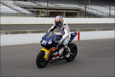 Le circuit mythique d'Indianapolis sera l'hôte, pour une première fois, d'une épreuve de MotoGP en septembre prochain. La configuration choisie diffère de celle employée pour la Formule 1. De plus, les motos rouleront dans le sens contraire à celui privilégié par les monoplaces. Le pilote américain Nicky Hayden a été invité à rouler sur le tracé et il s'est dit très impressionné par ce qu'il a vu, notamment par l'immensité des lieux. Il a donc piloté une Honda CBR1000 sur le circuit routier de 2,620 milles et ses premières impressions sont excellentes. Le pilote Repsol Honda croit que les motos de MotoGP puissent facilement atteindre les 300 km/h lorsqu'elles rouleront sur ce racé rapide. Photos : Ron McQueeney - IMS