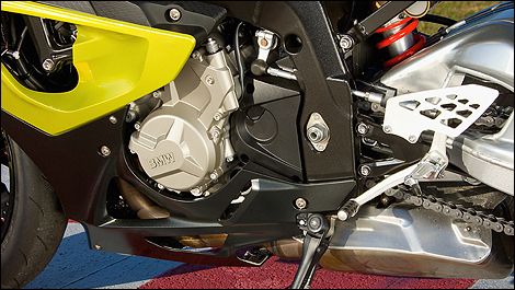 La configuration à quatre cylindres en ligne a été choisie pour rivaliser directement avec les Japonaises, en plus d’offrir un net avantage de puissance par rapport aux moteurs dont les masses en mouvement de va-et-vient (pistons, bielles, soupapes, etc.) sont plus élevées. La puissance maximale arrive vers les 13 000 tr/min, tandis que le régime maximal de 14 250 tr/min fournit une belle rallonge qui peut réduire le nombre de changements de rapport à la fin d’une ligne droite ou lorsqu’on double une semi-remorque en circulation lourde. Le couple maximal, quant à lui, arrive à 9750 tr/min après un généreux afflux dès 2000 tr/min — excellent pour les zones urbaines ou quand les policiers pointent leur radar.