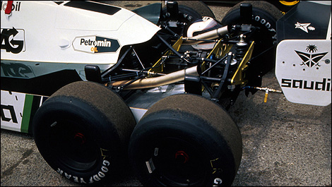 Williams found an unexpected feature of the six-wheeled design. In wet conditions slick tyres could be used on the rearmost axle because the road those wheels were running on was swept sufficiently clear of water by the tyres in front.